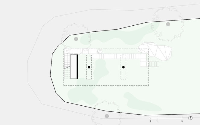 A área disponível para a construção compreende uma topografia que define uma espécie de recinto semifechado, contido por taludes preexistentes que formam uma concavidade aberta a leste. Sobre o eixo leste-oeste, no centro deste "recinto", implanta-se a construção a 2,40 metros acima do nível de acesso ao terreno. Para isso, lança-se mão de uma estrutura mista: um par de fundações, colunas e vigas em concreto, constituindo uma base sobre a qual nasce um esqueleto leve em estrutura metálica, com perfis laminados e tubulares.